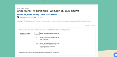 Please note, the processing fee varies, and you need to complete the purchase within 15 minutes. For general admission to the Center for Jewish History and Anne Frank Exhibit, the ticket is $24, with an additional $2 fee, bringing the total to $26. After this, continue by scrolling down and you can choose to receive the tickets on your mobile.